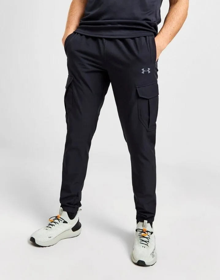 a staple that’s exclusive to JD in these men’s Woven Cargo Track Pants from Under Armour. In a Black colourway, these regular-fit cargos are crafted from an ultra-soft cotton poly blended fabric for all-day comfort. They feature an elastic waistband to bring you a snug, supportive feel, while cuffed ankles let you flex your footwear. With cargo pockets for storage and a utility vibe, they’re finished with the UA logo to the leg. Machine washable. | Our model is 6’0″ and wears a size medium.
