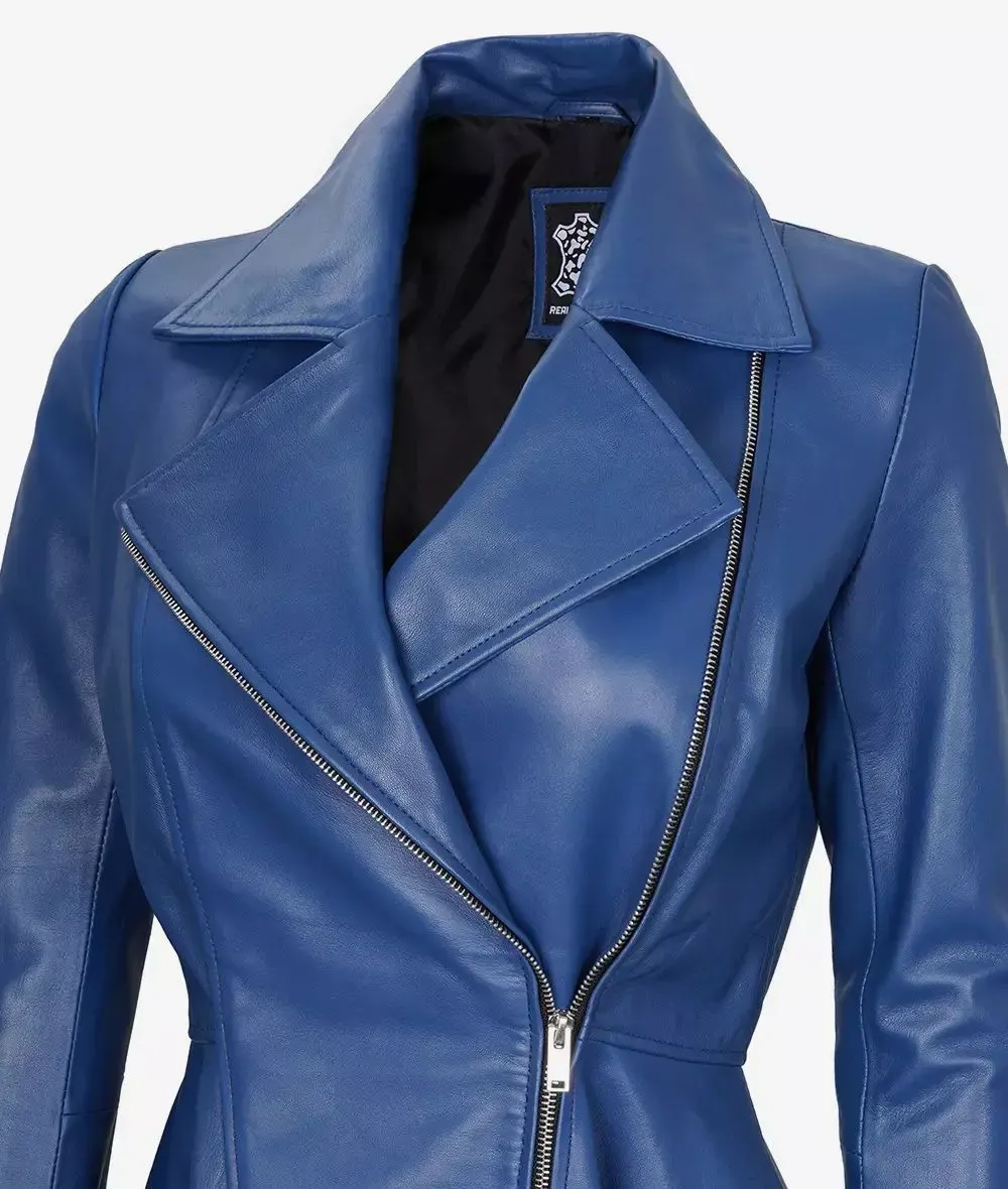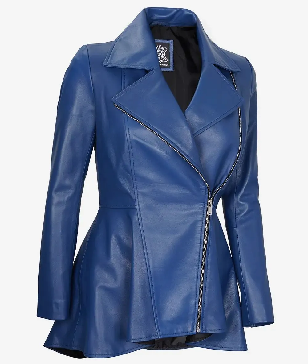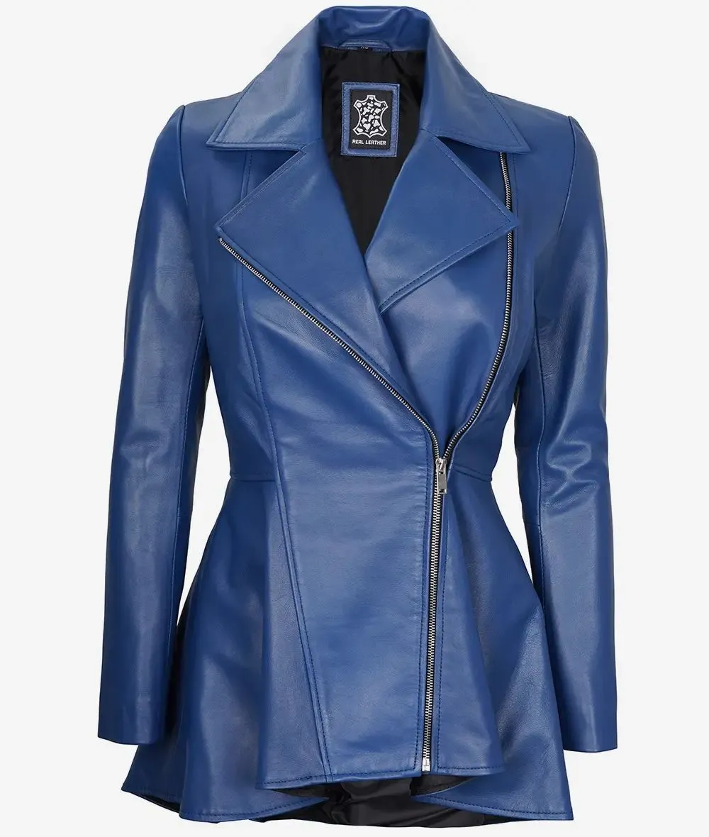 Women’s New Slim Fit Moto Biker Genuine Sheepskin Blue Leather Peplum Jacket