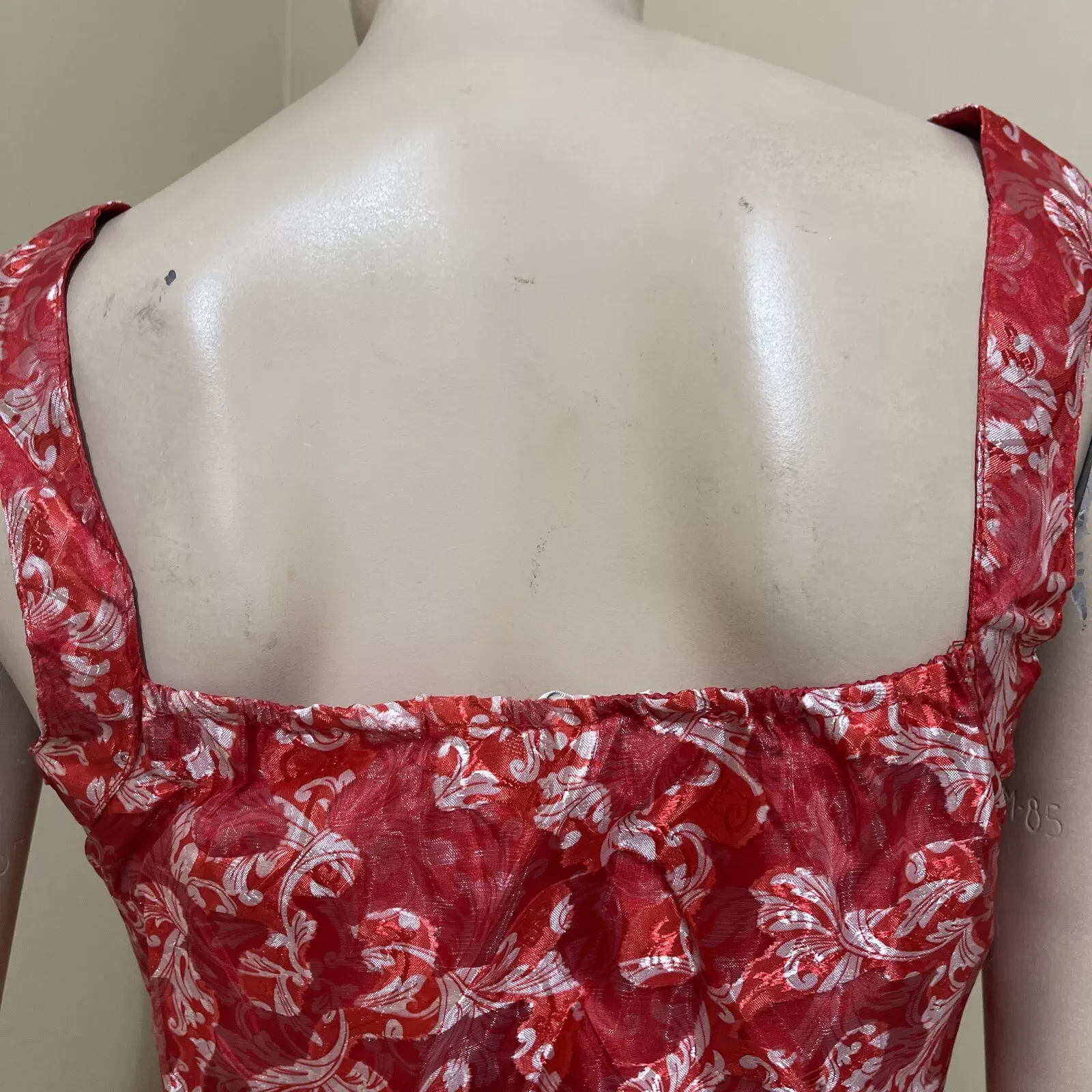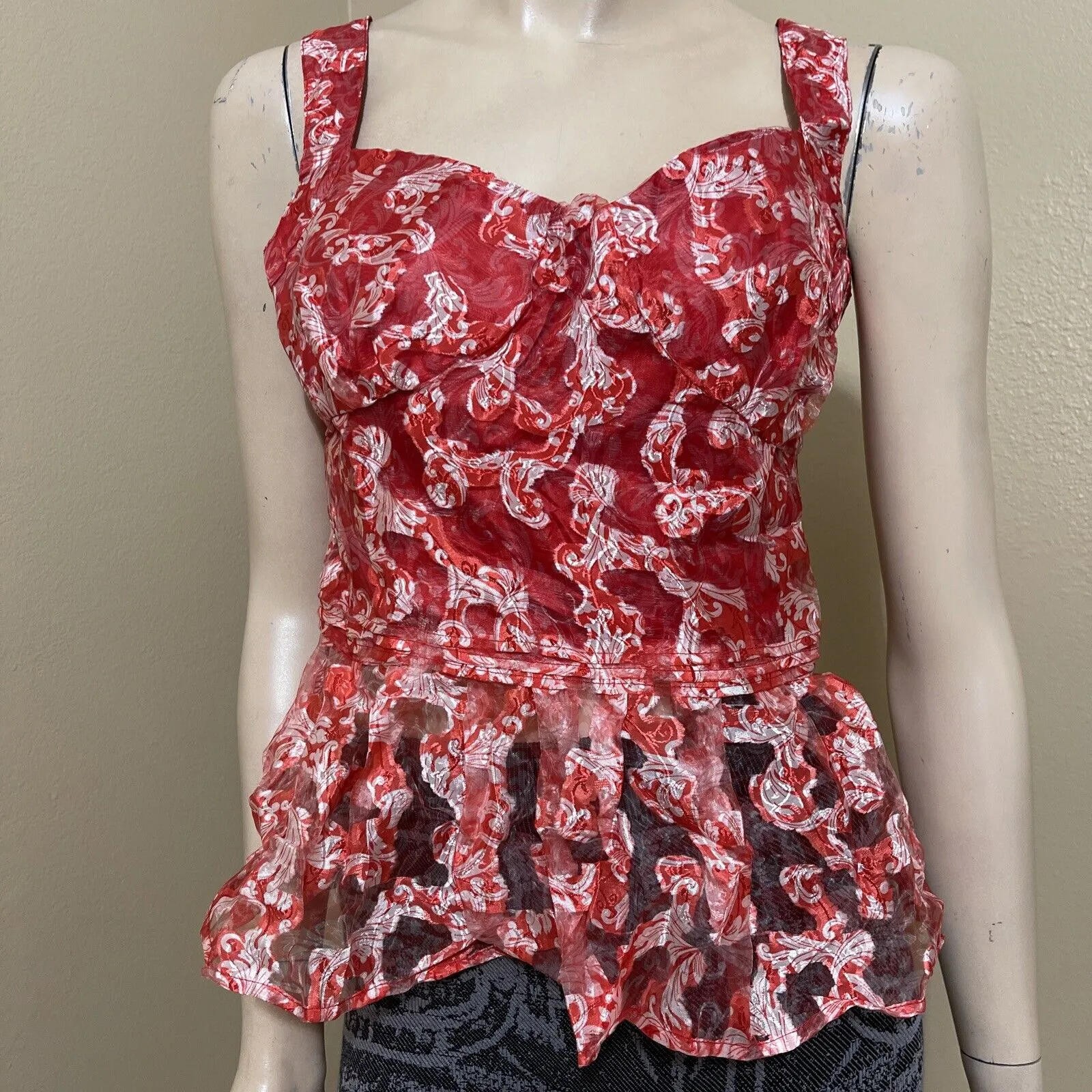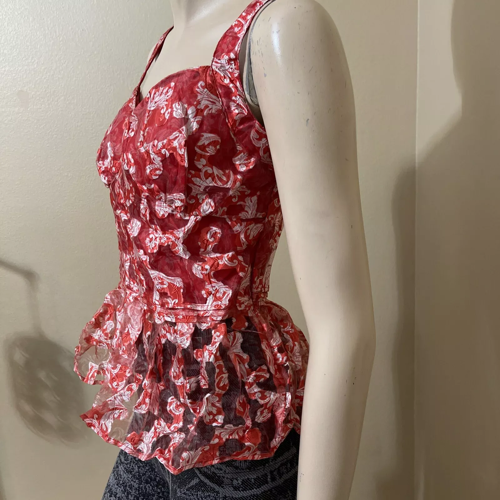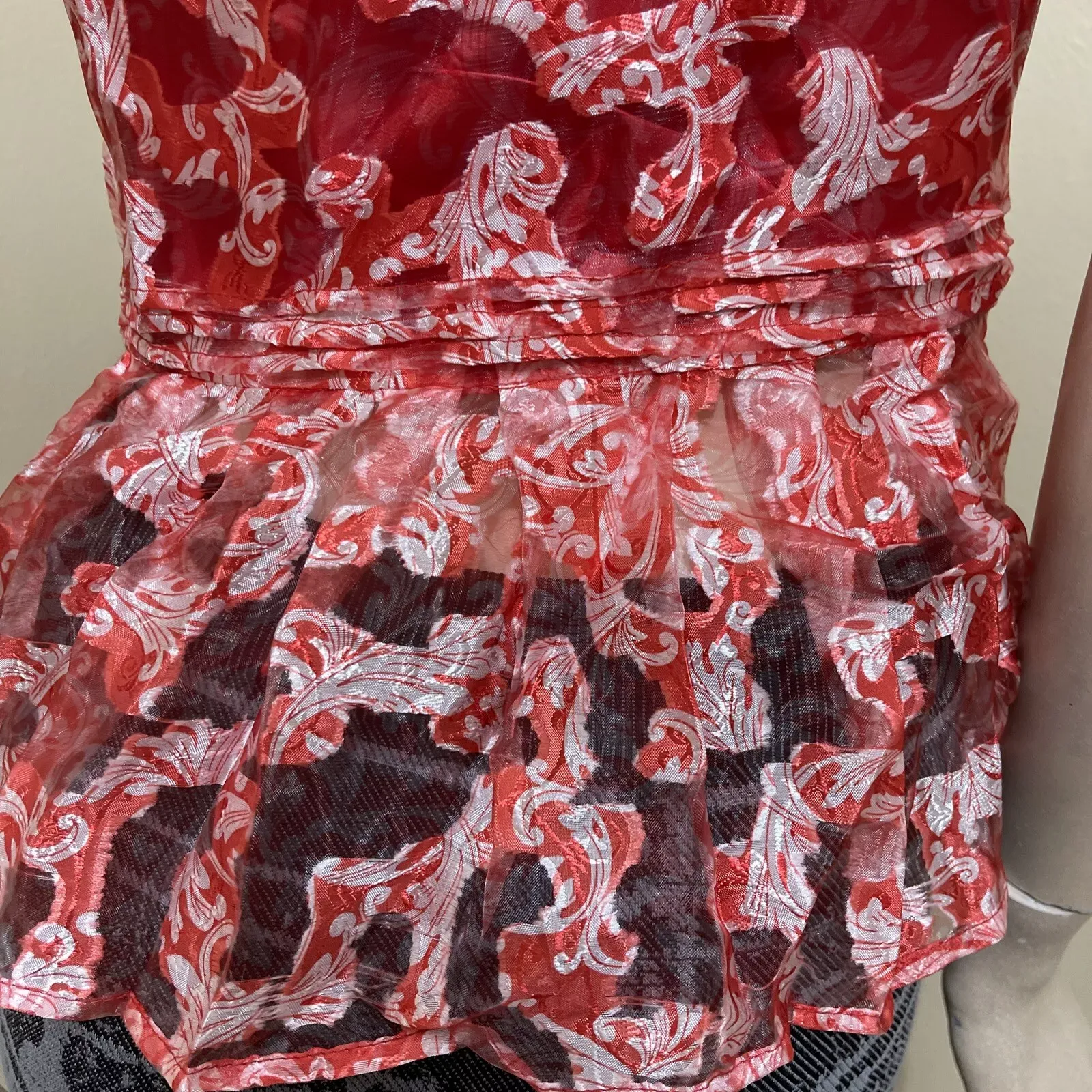 Women’s Red white Floral polyester casual summer open sleeveless layered zipper sheer size L blouse top tunic